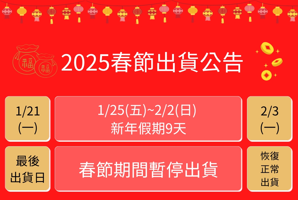 ● 因春節因素物流繁忙,配送商品不保證準時送達,請提早預訂避免延遲到貨,不便之處敬請見諒,年後將依訂單順序盡速安排出貨。