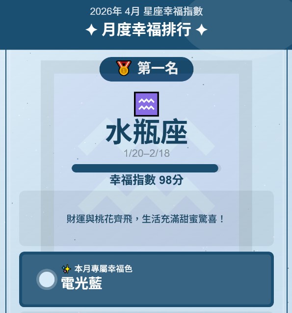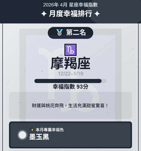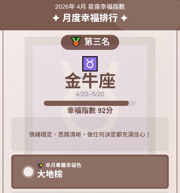 12星座幸福指數全面解析登場!✨ 本月依據星象能量排行,為每個星座量身打造專屬幸福色彩,從烈焰紅到薰衣草紫,每一種顏色都蘊藏宇宙給你的祝福與指引。無論你是熱情的牡羊、神秘的天蠍,還是浪漫的雙魚,都能在這份排行中找到屬於自己的能量密碼。收藏這份星座幸福地圖,讓色彩成為你本月最強的幸運符,引領你走向更豐盛、更甜蜜的生活!
